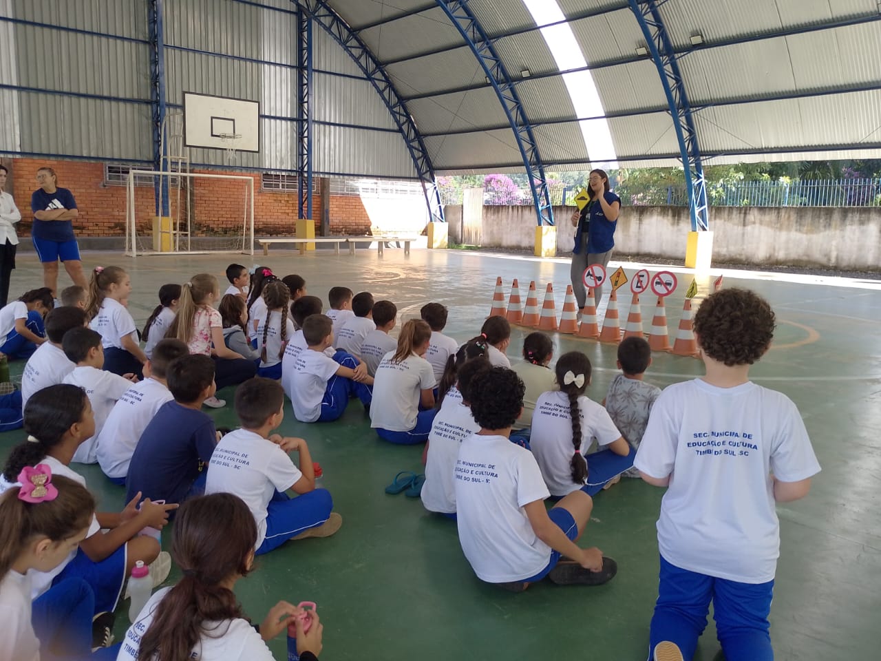 Na Escola Municipal de Ensino Fundamental Frei Modesto também foram realizadas atividades educativas com estudantes das séries iniciais. A proposta abordou cuidados de pedestres e responsabilidades de motoristas por meio de uma dinâmica lúdica com placas de trânsito e cones. Durante a simulação, os alunos percorreram um circuito assumindo alternadamente os papéis de motoristas e pedestres, interpretando a sinalização ao longo do trajeto. Ao final, uma roda de conversa retomou o significado das placas utilizadas e destacou a importância de compreender e respeitar a sinalização de trânsito no cotidiano.